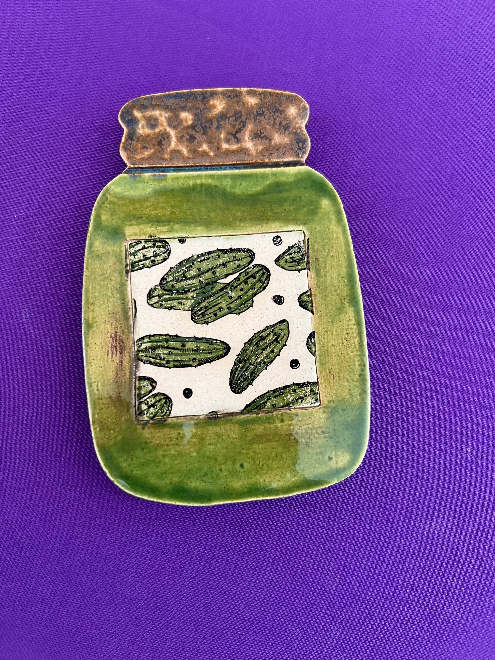 Pickle jar shaped spoon rest with pickle transfer in foliage green glaze.