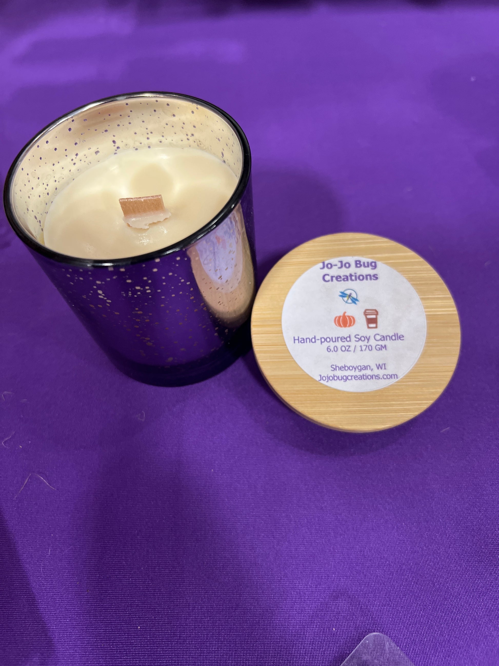 Pumpkin, Vanilla, and Cinnamon Scented 6oz Soy Candle in Purple Mercury Glass
