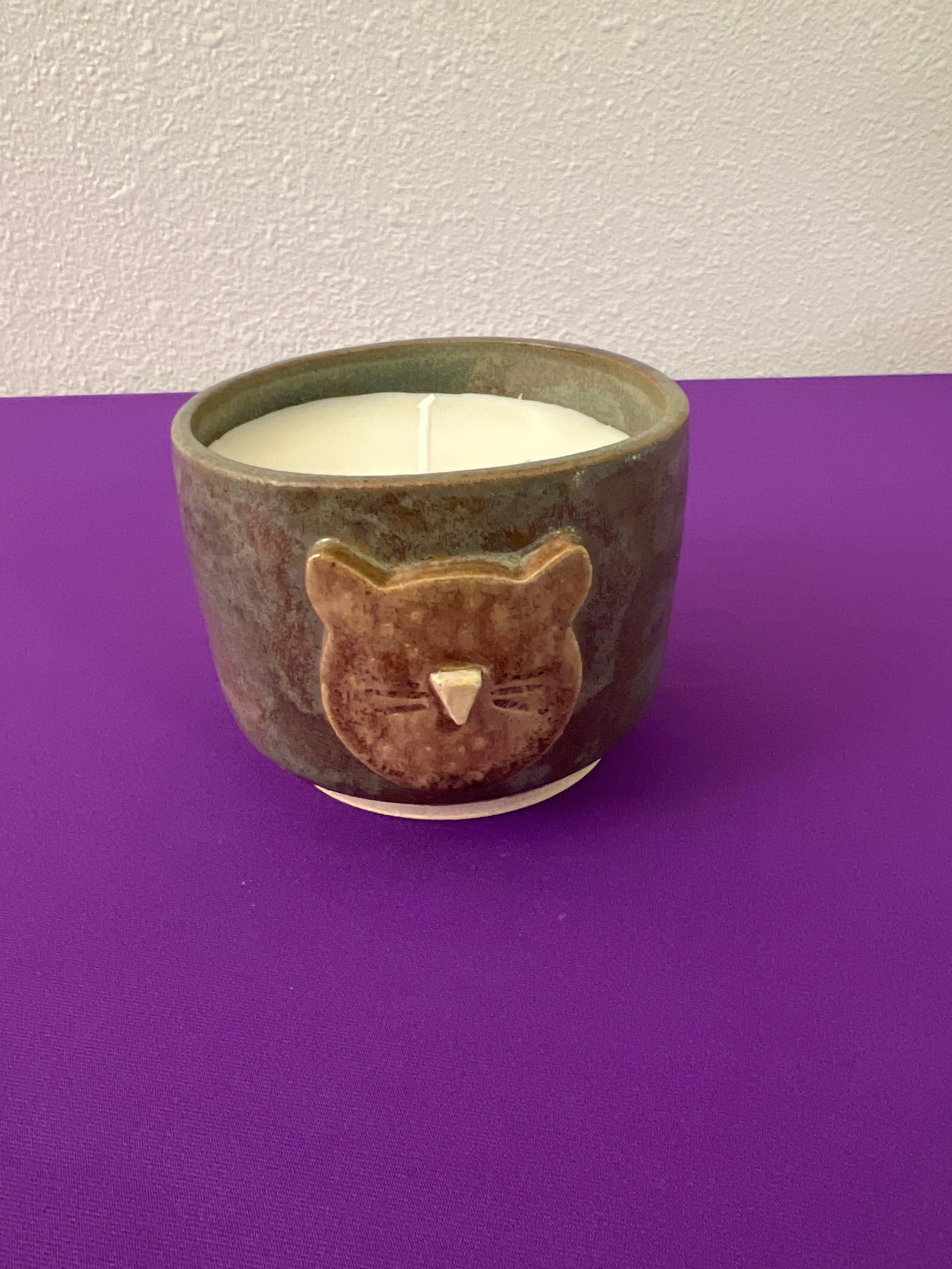 Unscented Soy Candle in Ceramic Holder with Cat Face Design in Smoke and Micro Champagne Glaze.