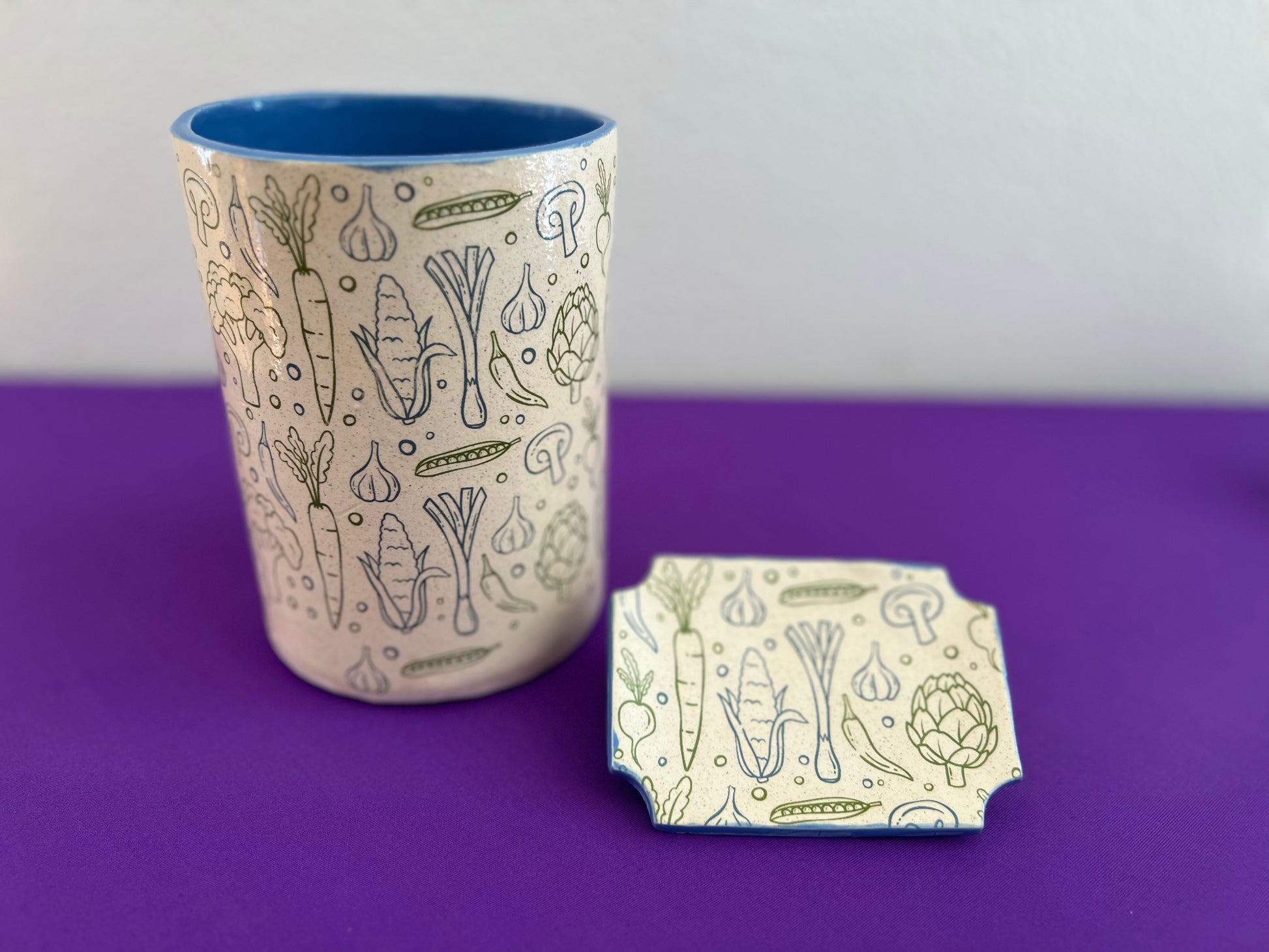 Ceramic Utensil Canister/Spoon Rest Set with vegetable transfer in hydrangea glaze.